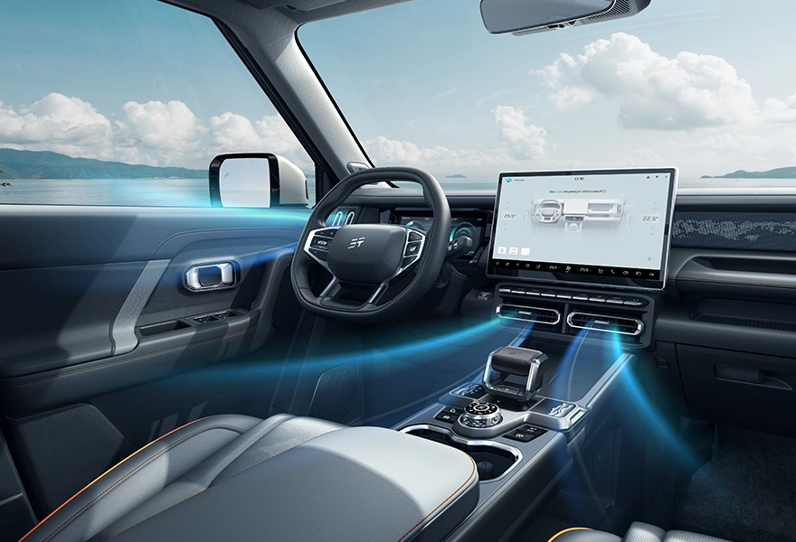 Двухзонный климат-контроль оснащен эффективным фильтром стандарта CN95, который гарантирует чистый воздух. Физические кнопки для управления климат-контролем расположены под центральным экраном.